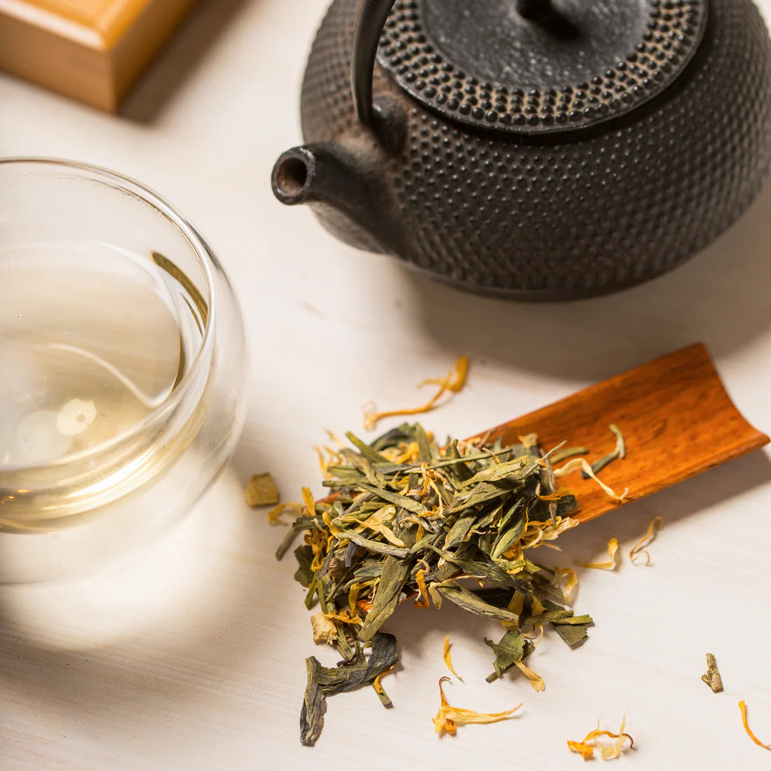 A lively and zesty blend combines Longjing green tea with a burst of freshness from Australian lemon myrtle, golden ginger pieces and a sprinkle of calendula petals. Perfect for those sleepy mornings. Like sunshine in a cup.
